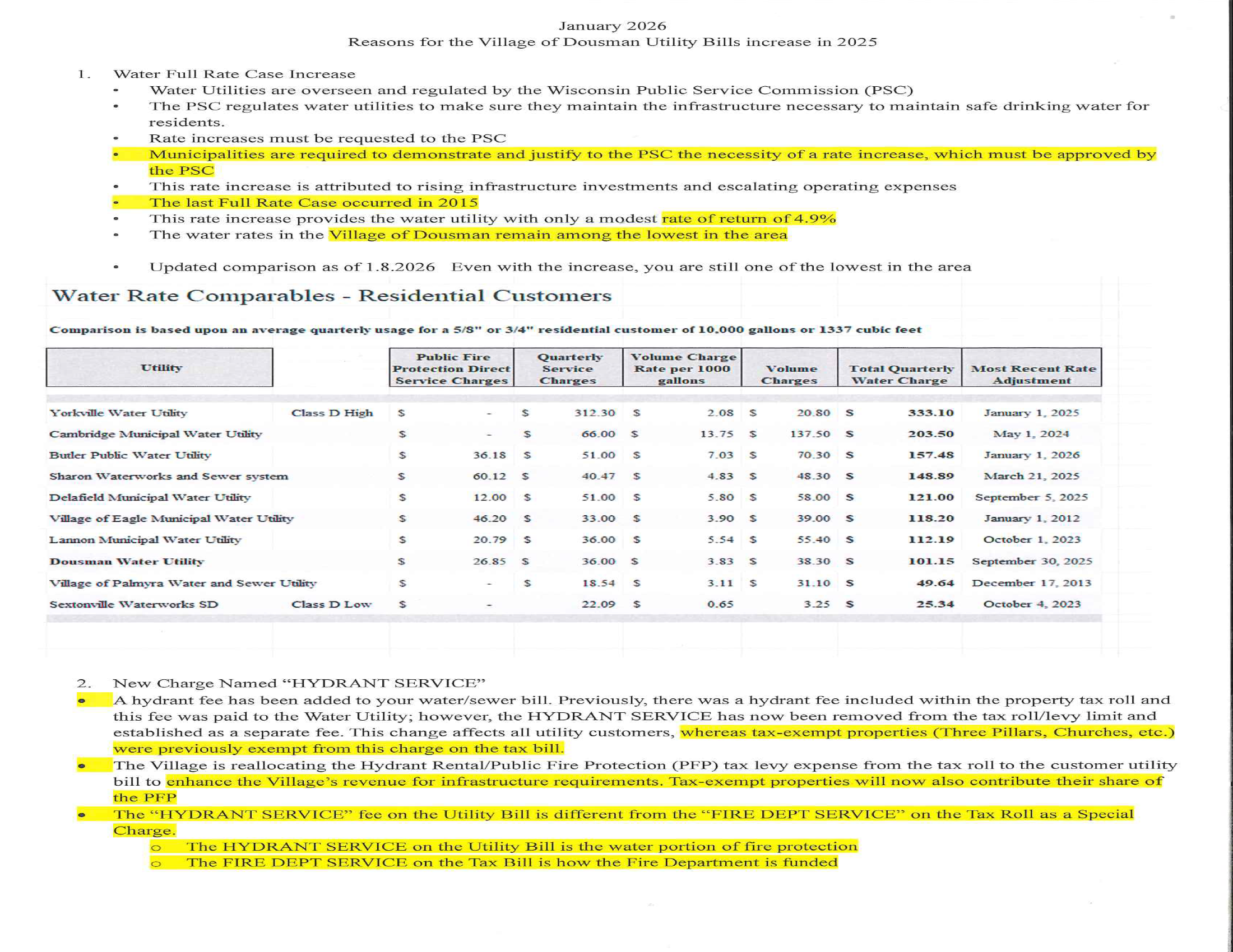 • The water rates in the Village of Dousman remain among the lowest in the area